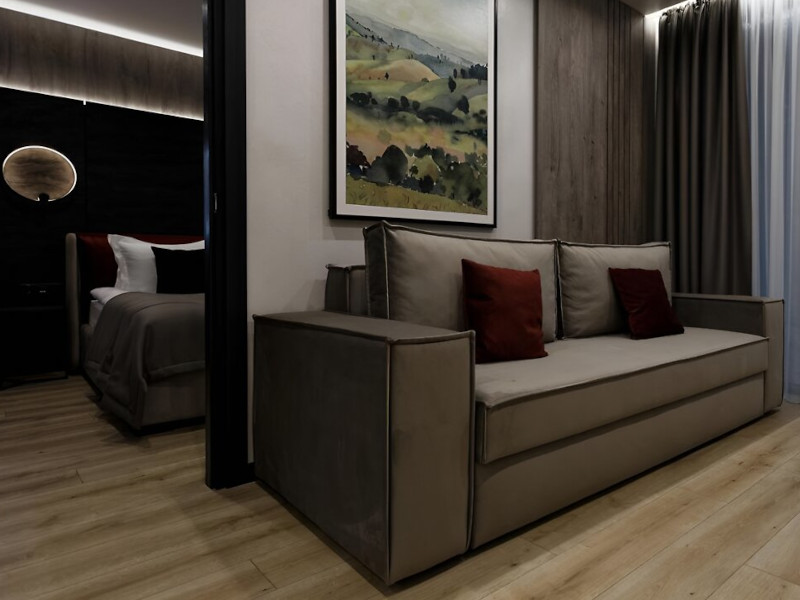 - Двоспальне ліжко та розкладний диван для двох осіб.